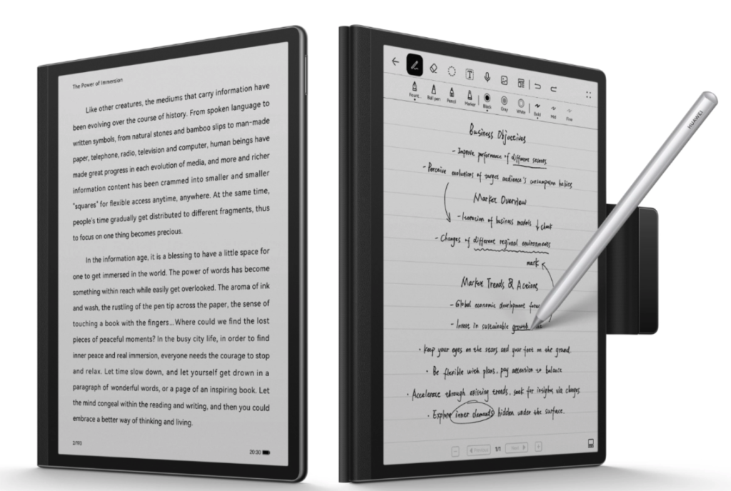 https://consumer.huawei.com/en/tablets/matepad-paper/$560.00 – 227dpi, 10.3″, Kirin 820E CPU,64GB storage, mic, speakers, pen