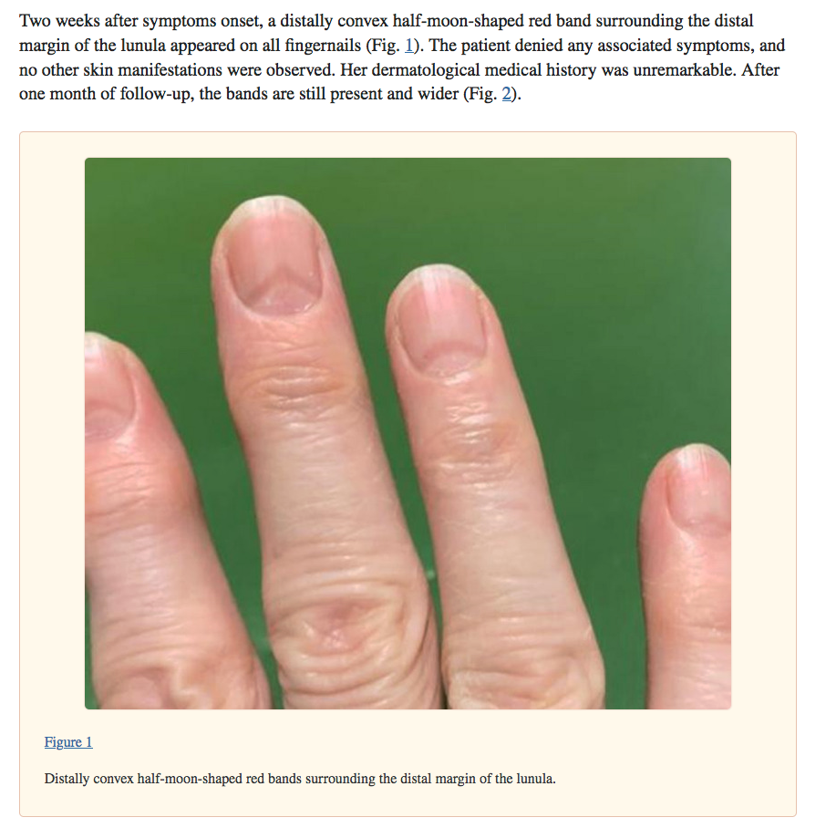 The pathogenesis of the half‐moon‐shaped transversal red bands seen in our patient after SARS‐CoV‐2 infection is unknown. A localized microvascular injury secondary to inflammatory immune response and a procoagulant state 7 might play a central role. Due to the localization, we hypothesized a damage of the capillary network of the distal subungual arcade.