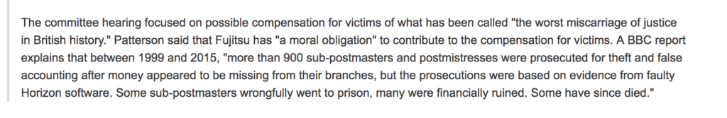 Uncategorized Fujistu software bug at core of case falsely convicting British Postmaster’s of Embezzeling. by adminJanuary 19, 2024January 19, 2024 https://tech.slashdot.org/story/24/01/17/1644256/fujitsu-is-sorry-that-its-software-helped-send-innocent-people-to-prison