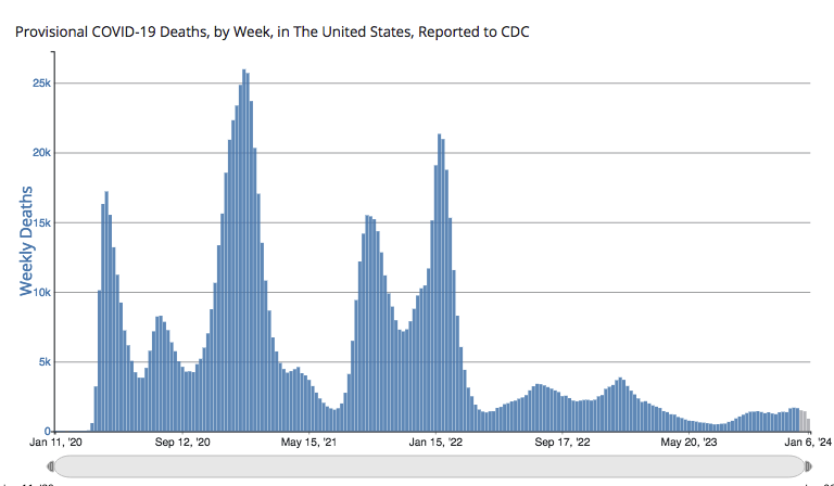 Uncategorized If the news said there was a madman killing 1000 Americans a week, it sounds bad. But Covid taking 1400 a week… by adminJanuary 15, 2024 https://covid.cdc.gov/covid-data-tracker/#trends_weeklydeaths_select_00