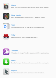 A collection of lovely mac utilities. I just used keycodes which lets you see the key code for anything you type. Utilities that look nice: menuwhere, time sink, usher, moom , and name mangler